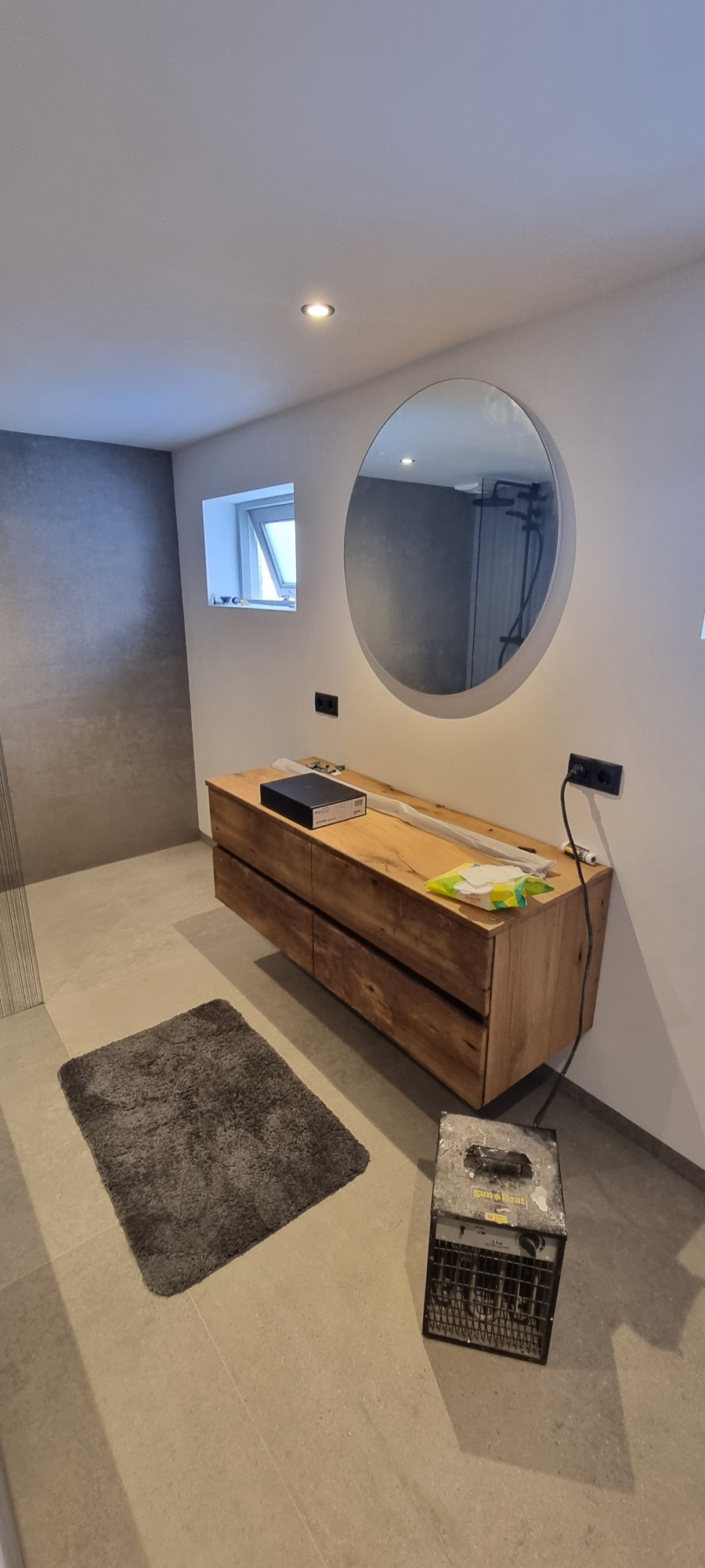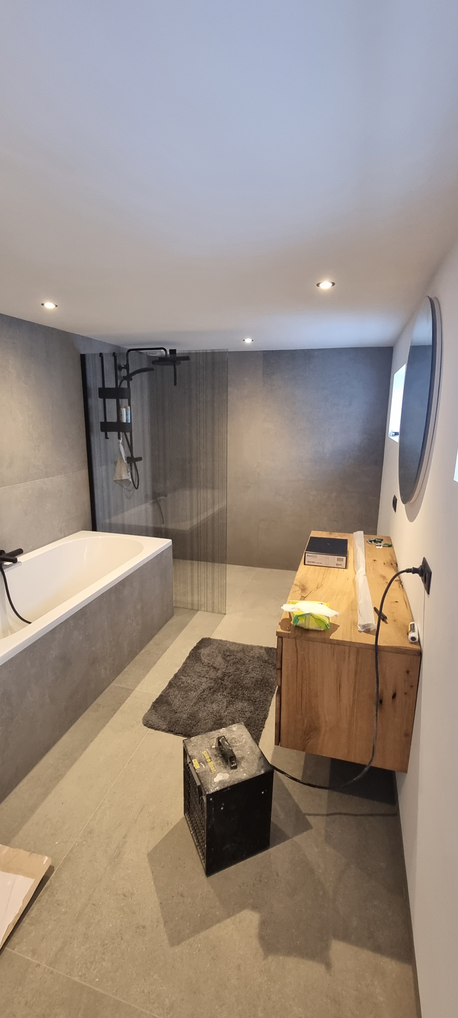 - Voorbereiding: Oude tegels en sanitair worden vakkundig verwijderd, leidingen en elektriciteit aangepast waar nodig.